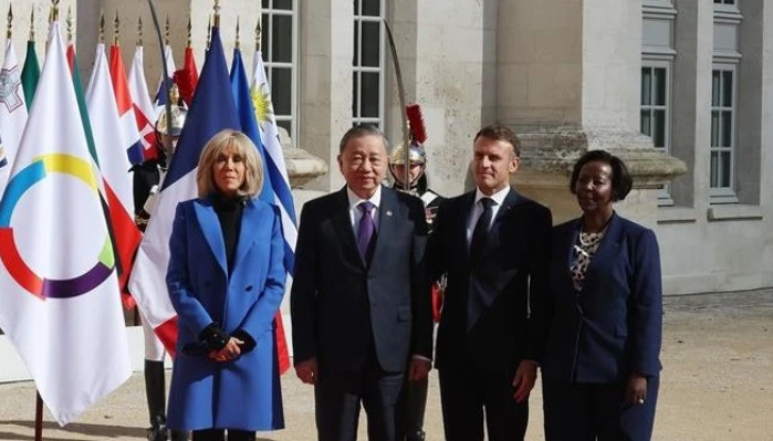 | Tổng thống Cộng hòa Pháp Emmanuel Macron và Tổng Thư ký Pháp ngữ Louise Mushikiwabo đón Tổng Bí thư, Chủ tịch nước Tô Lâm. Ảnh: Trí Dũng – TTXVN |