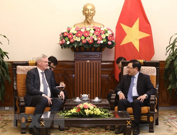 Phó Thủ tướng, Bộ trưởng Bộ Ngoại giao Phạm Bình Minh tiếp Thứ trưởng thứ nhất Bộ Ngoại giao Nga V.Titov đang thăm và làm việc tại Việt Nam. (Ảnh: Văn Điệp/TTXVN)