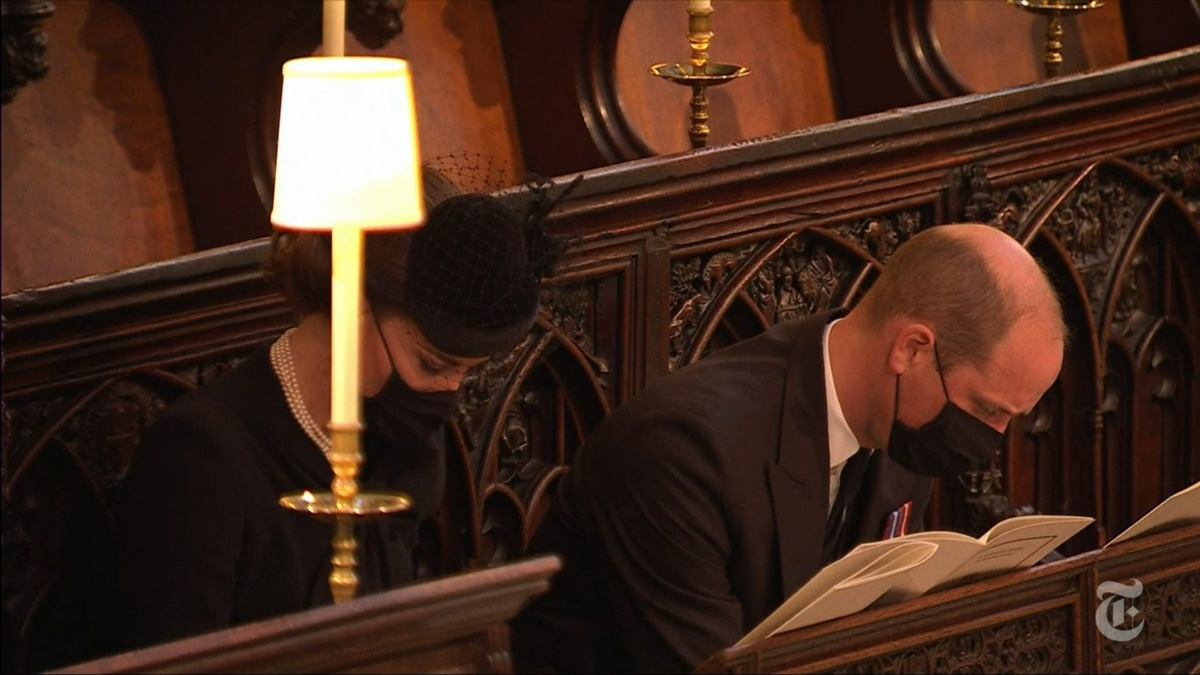 Vợ chồng Hoàng tử William cúi đầu mặc niệm khi nghe thánh ca tại tang lễ Hoàng thân Philip. Ảnh: Telegraph