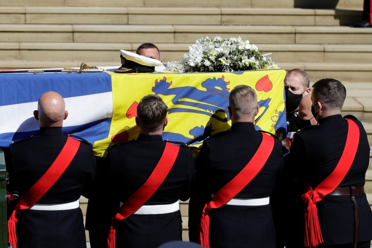 Linh cữu của Hoàng thân Philip được đưa xuống xe và đưa vào trong nhà nguyện St. George. Ảnh: Reuters