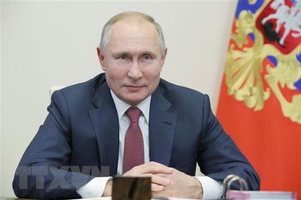 Tổng thống Nga Vladimir Putin trong một cuộc họp trực tuyến tại Novo-Ogaryovo, ngoại ô Moskva. (Ảnh: AFP/TTXVN)