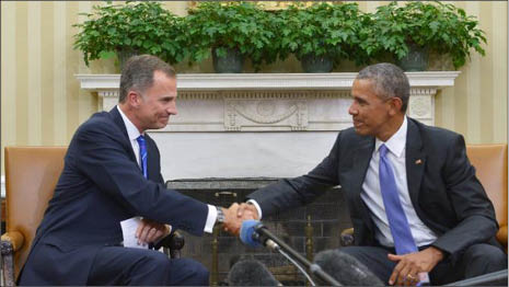 Tổng thống Obama tỏng cuộc gặp với nhà vua Tây Ban Nha Felipe VI tại Washington. Ảnh: Efe