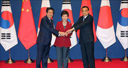 Từ trái sang phải: Thủ tướng Nhật Bản Shinzo Abe, Tổng thống Hàn Quốc Park Geun-hye và Thủ tướng Trung Quốc Lý Khắc Cường. Ảnh: AP