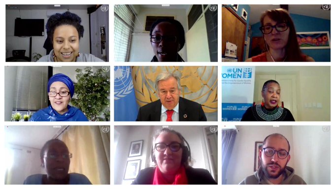 TTK LHQ António Guterres trong một phiên họp trực tuyến với đại diện các tổ chức vì sự tiến bộ của phụ nữ. Ảnh: UN News