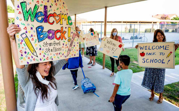 Giáo viên chào đón học sinh quay lại trường ngày đầu tiên tại Trường tiểu học Stanford ở TP Garden Grove, bang California (Mỹ) vào ngày 16-8 - Ảnh: GETTY IMAGES