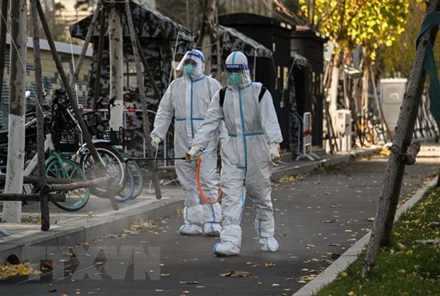 Phun thuốc khử trùng nhằm ngăn chặn sự lây lan của dịch COVID-19 tại Bắc Kinh, Trung Quốc. Ảnh: AFP/TTXVN