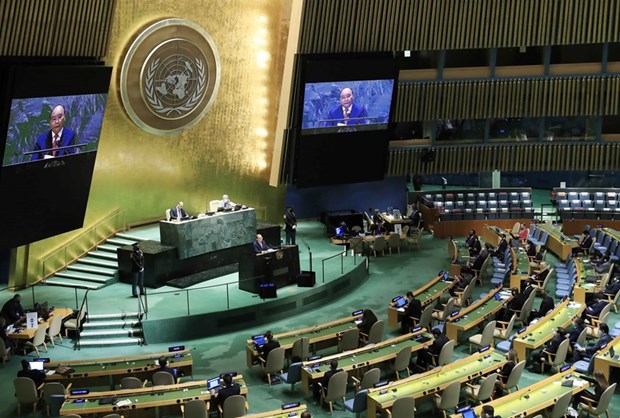 Chủ tịch nước Nguyễn Xuân Phúc phát biểu tại Phiên thảo luận Cấp cao Đại hội đồng Liên Hợp quốc lần thứ 76. Ảnh: Thống Nhất/TTXVN