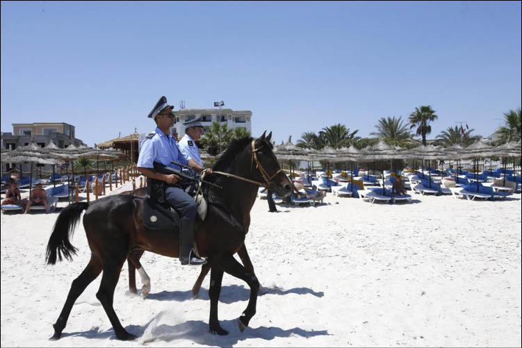 Nhân viên cảnh sát tuần tra trên bãi biển Sousse, Tunisia. Ảnh: AP