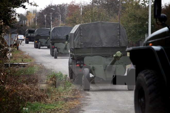 Xe của lực lượng ly khai chở súng chống tăng MT-12 Rapira 100-mm rút khỏi Donetsk ngày 28/10. (AFP/TTXVN)