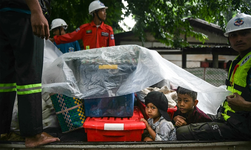 | Nhân viên cứu hộ Myanmar sơ tán trẻ em tại vùng bị ảnh hưởng bởi bão Yagi. Ảnh: Disway |