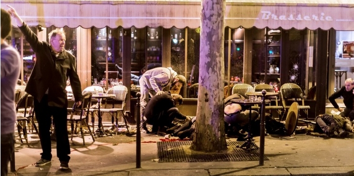 Hiện trường vụ tấn công trước một nhà hàng ở Paris đêm 13/11/2015. Ảnh: AFP.