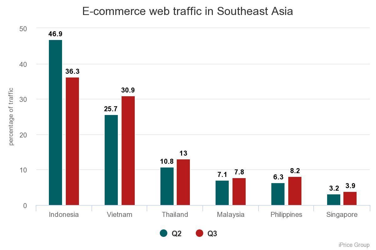 Theo báo cáo “Bản đồ thương mại điện tử Đông Nam Á”, so với quý II, lưu lượng truy cập các web thương mại điện tử tại Việt Nam đã tăng 5,2 điểm phần trăm, mức tăng trưởng cao nhất trong 6 quốc gia được nghiên cứu, trong khi thị trường hàng đầu Indonesia giảm 10,6 điểm phần trăm.