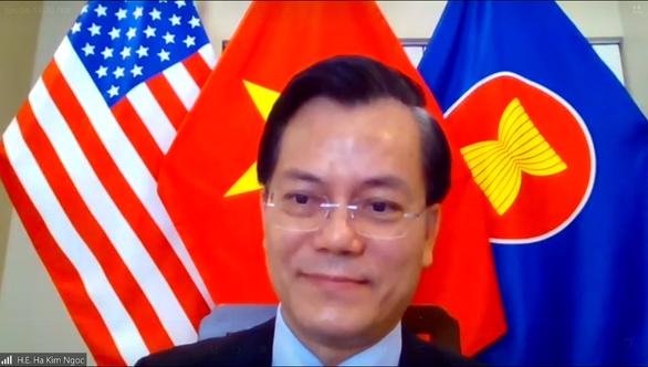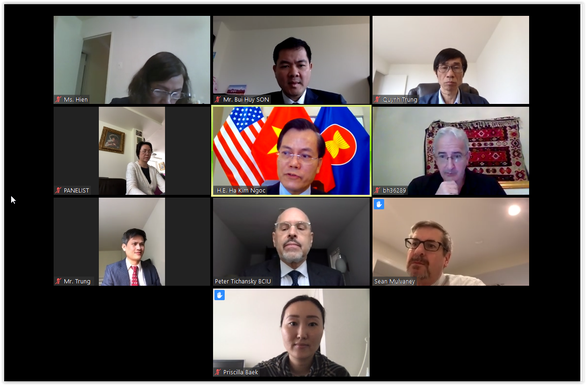 Trong thông cáo phát ngày 15-4, đại sứ quán Việt Nam tại Mỹ cho biết đại sứ Hà Kim Ngọc đã có buổi trao đổi trực tuyến với chủ tịch Hội đồng kinh doanh vì sự hiểu biết quốc tế (BCIU) Peter Tichansky và đại diện cấp cao 40 doanh nghiệp lớn của Mỹ tại thủ đô Washington ngày 14-4.