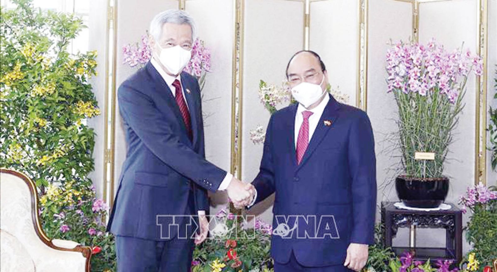 Chủ tịch nước Nguyễn Xuân Phúc gặp Thủ tướng Singapore Lý Hiển Long ngày 25/2/2022. Ảnh: TTXVN