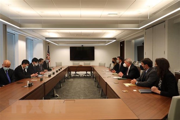 Toàn cảnh buổi làm việc giữa Thứ trưởng Bộ Nông Nghiệp và Phát triển nông thôn Việt Nam Lê Quốc Doanh và Chủ tịch kiêm Giám đốc điều hành Hội đồng Ngũ cốc Mỹ Ryan LeGrand. Ảnh: Đặng Huyền/TTXVN