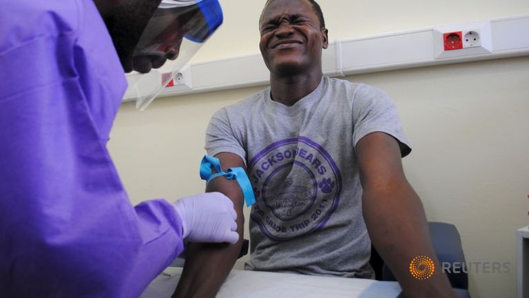 Nhân viên y tế đang lấy máu của một bệnh nhân nhiễm Ebola đã hồi phục để kiểm tra - Ảnh: Reuters