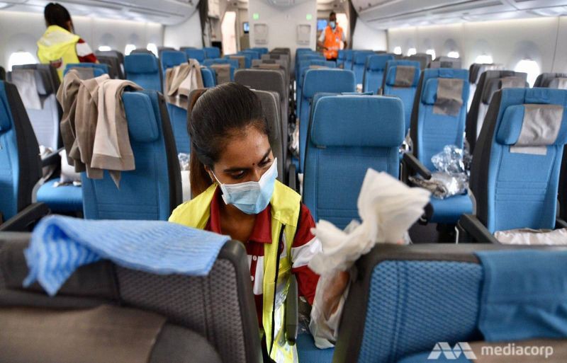 Các nhân viên y tế tiến hành khử trùng trên một chiếc máy bay của Singapore. Ảnh: Mediacorp