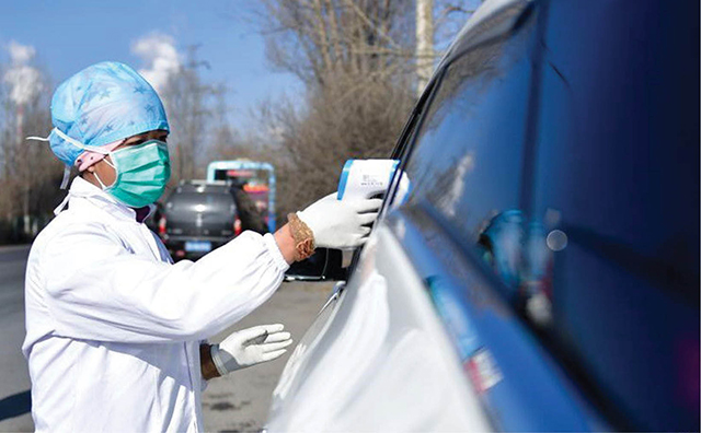 Nhân viên y tế Trung Quốc đo thân nhiệt của một tài xế trong chiến dịch phòng chống virus Corona. Ảnh: Tân Hoa Xã/VOV