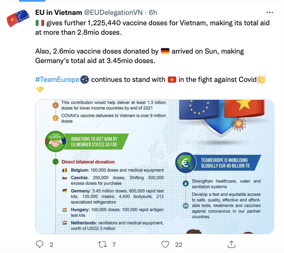 EU tại Việt Nam đăng thông tin Ý viện trợ thêm 1,2 triệu liều vắc xin cho Việt Nam, kèm theo thống kê chi tiết về hỗ trợ dành cho Việt Nam của EU - Ảnh: Twitter