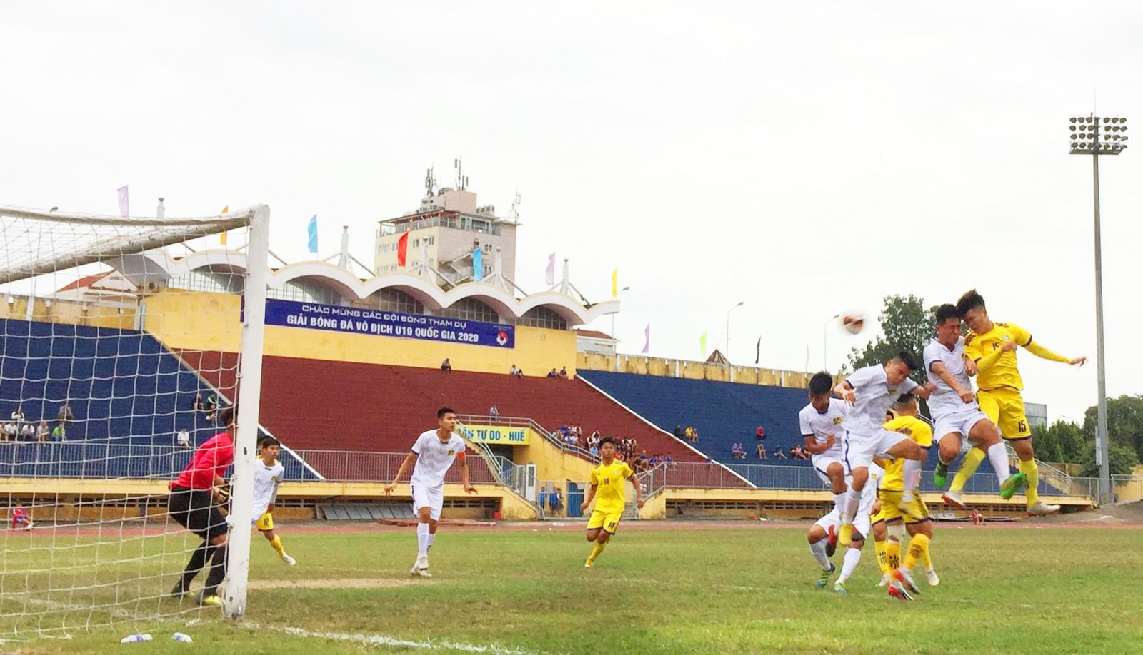 Một pha không chiến giữa U19 Thừa Thiên Huế (trắng) với U19 Sông Lam Nghệ An