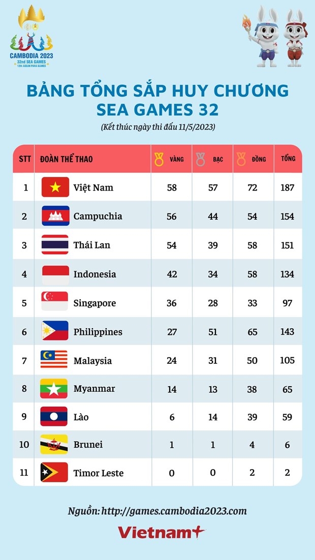 Đoàn Thể thao Việt Nam vững vàng ở ngôi đầu bảng tổng sắp huy chương SEA Games 32 với 58 huy chương Vàng, 57 huy chương Bạc và 72 huy chương Đồng.