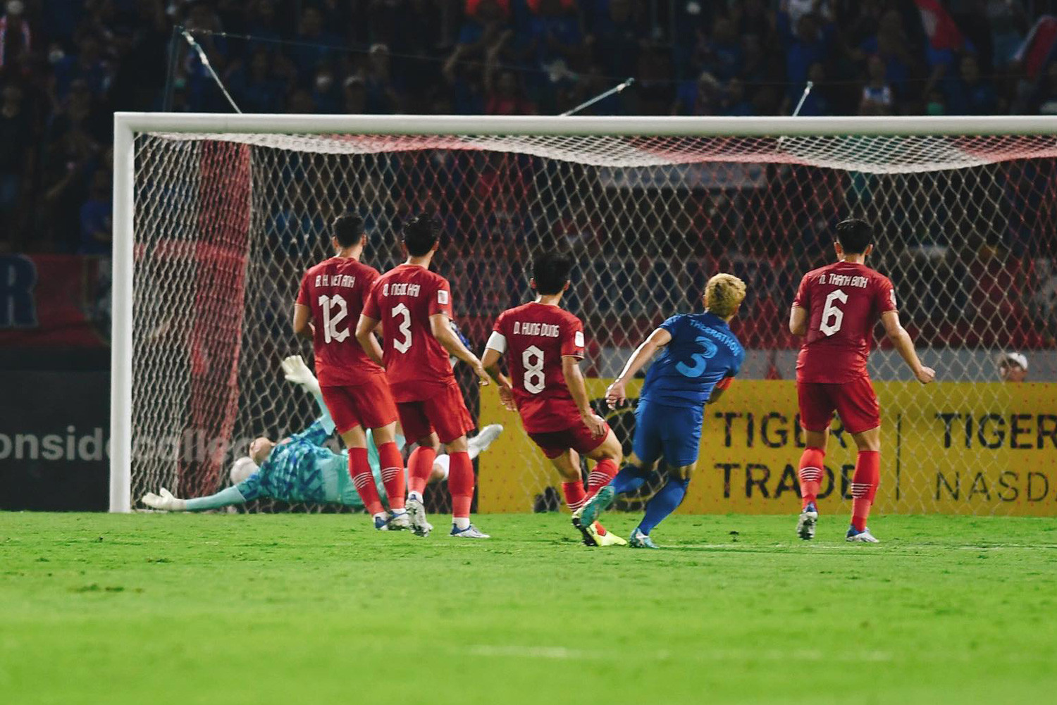 Những gì diễn trên sân đã chống lại thầy trò Park Hang-seo. Ngay từ phút 25, người Thái đã có bàn mở tỷ số. Đón đường chuyền của đồng đội từ cánh trái vào, đội trưởng Theerathon Bunmathan dẫn bóng một nhịp rồi tung cú sút rất căng và hiểm hóc từ ngoài vòng cấm đánh bại thủ thành Đặng Văn Lâm. Tỷ số 1-0 cũng đồng nghĩa với việc, những "Chiến binh sao vàng" cần ghi thêm 2 bàn, đồng thời không thủng lưới mới có thể lên ngôi vô địch. Bàn thắng của tuyển Thái Lan khiến Hùng Dũng và đồng đội gặp vô bàn khó khăn trong những phút thi đấu còn lại của hiệp 1, thậm chí HLV Park Hang-seo đã tung Quang Hải vào sân ngay sau đó nhưng không đã có bất ngờ nào xảy ra ở 45 phút đầu tiên. Dù rất nỗ lực nhưng tuyển Việt Nam vẫn thi đấu bế tắc.