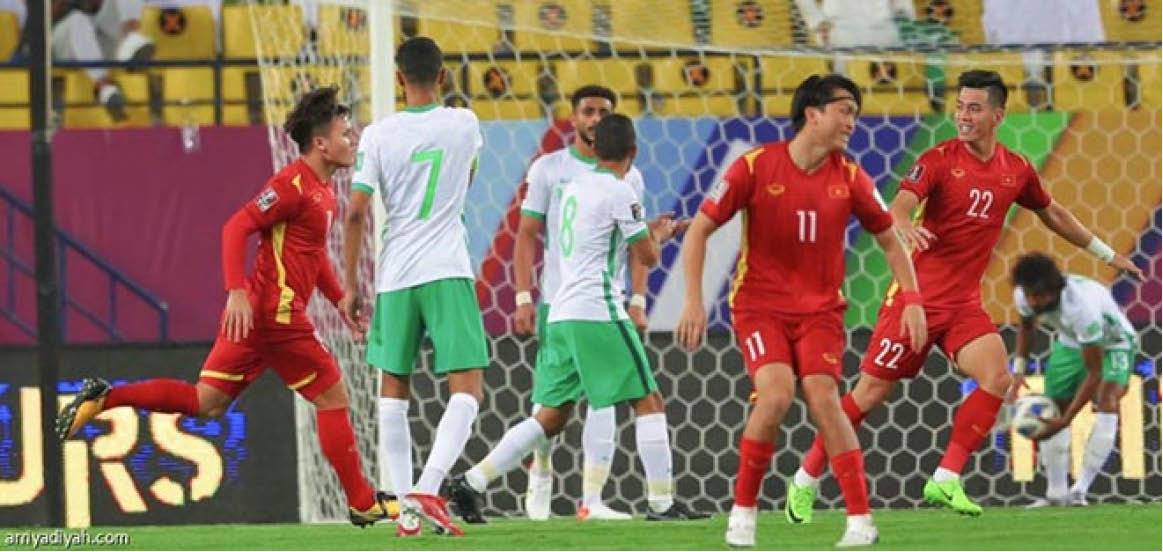 Quang Hải (ngoài cùng, bên trái) mở tỉ số cho tuyển Việt Nam trong trận gặp Saudi Arabia. Ảnh: Arriyadiyah