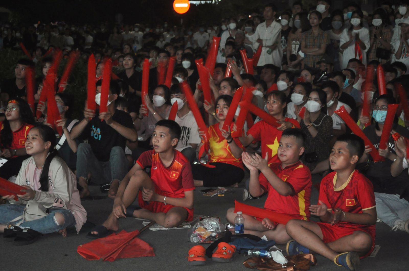 Không khí mừng chiến thắng của cổ động viên dường như vẫn vẹn nguyên như những ngày cuối năm 2019. Trận đấu kết thúc hơn 21h, một giờ sau đó ở khu vực trước Trung tâm Thể thao, đường Hà Huy Tập vẫn còn đông nghẹt người.