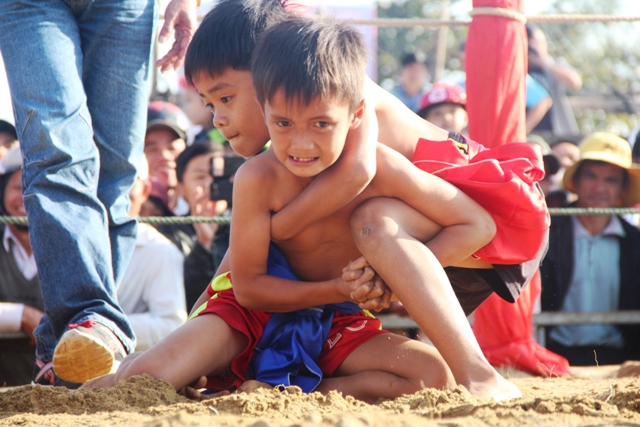 Hai đô vật thiếu nhi tranh tài mở màn cho sới vật làng Sình.