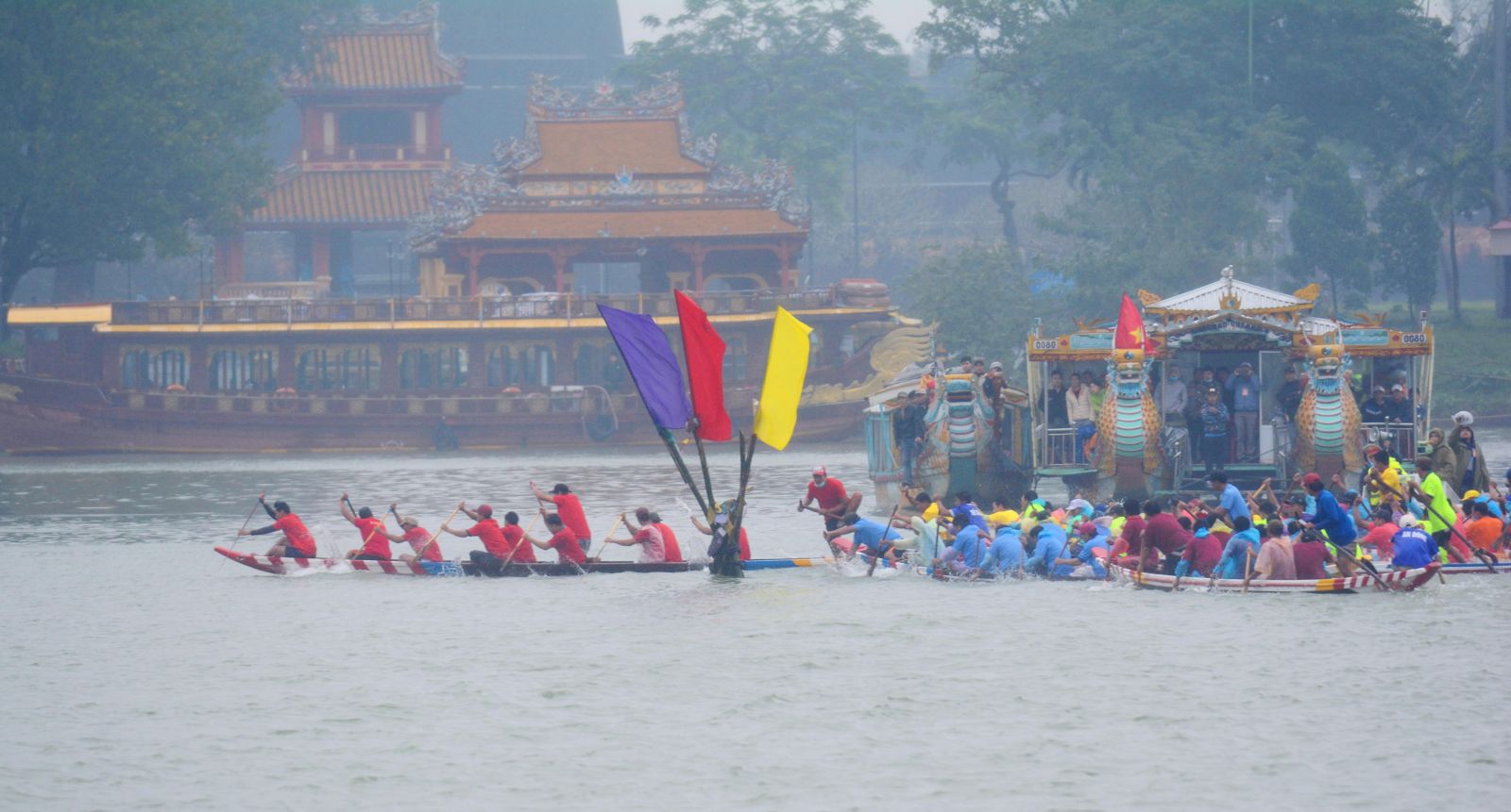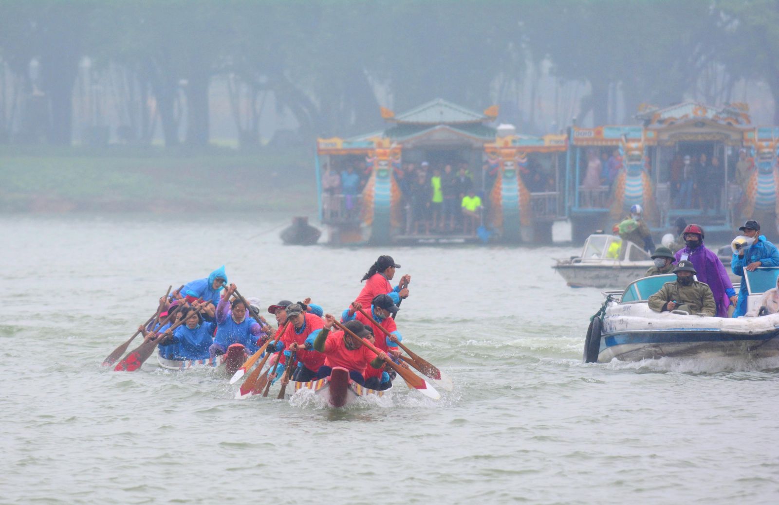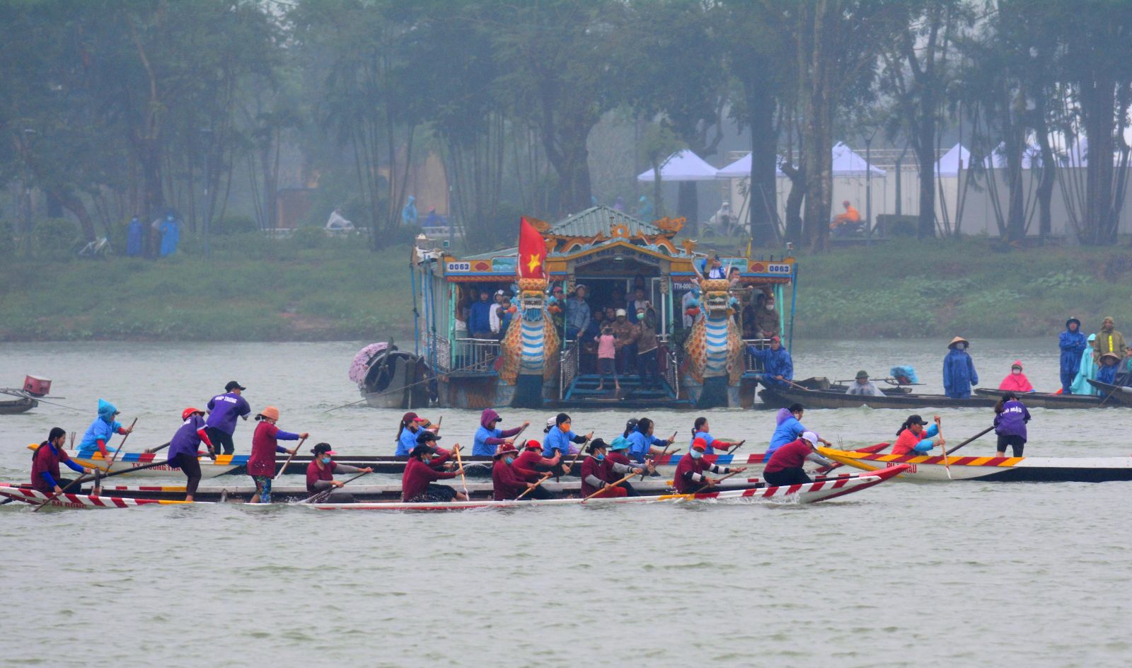 Bất chấp mưa rét, từ sáng sớm, hai bên bờ sông Hương đã chật kín người đến cổ vũ cho giải đua