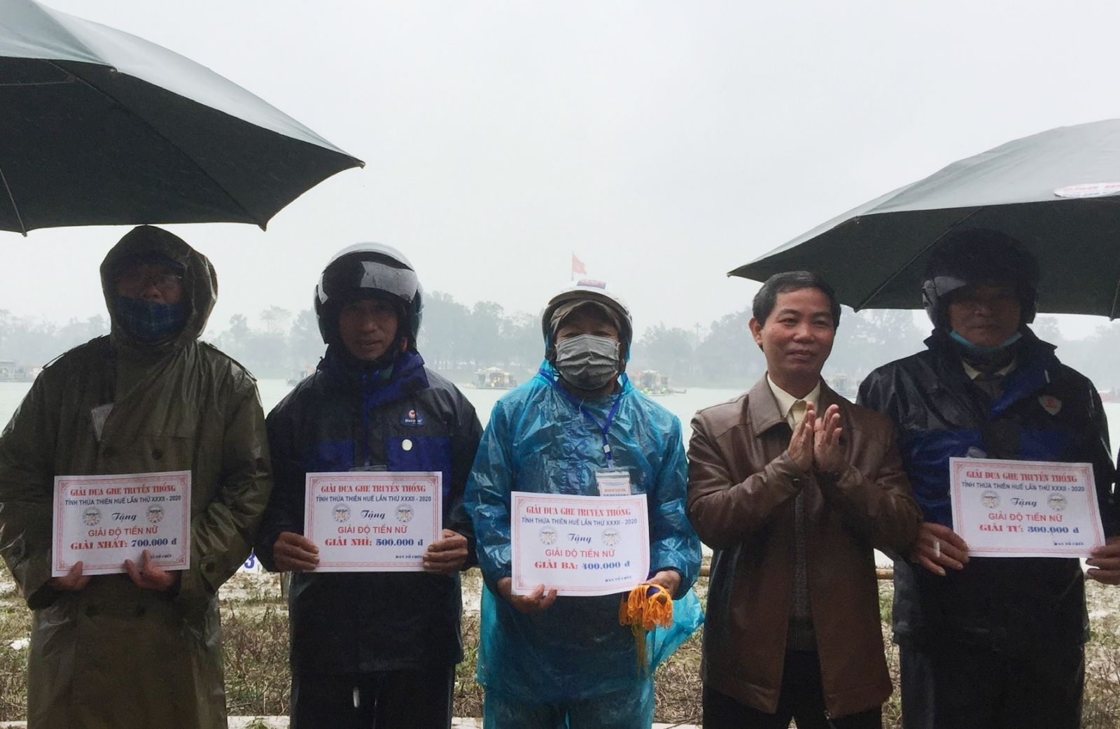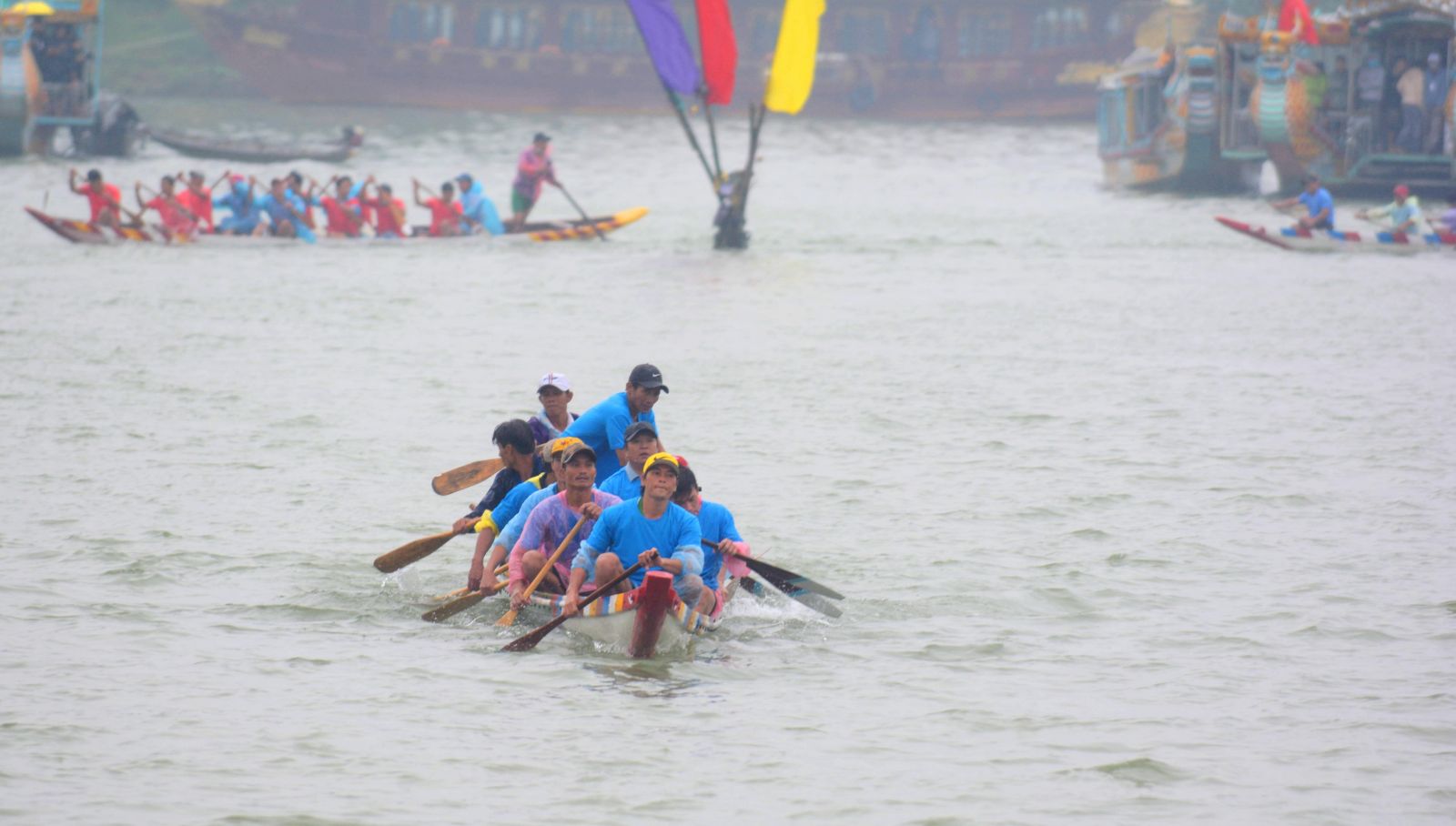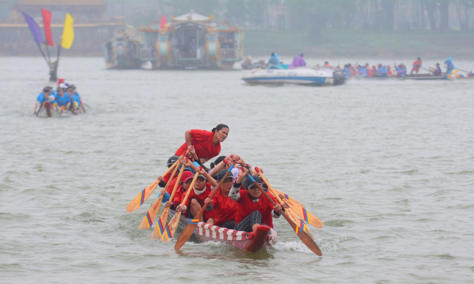 Bất chấp mưa rét, từ sáng sớm, hai bên bờ sông Hương đã chật kín người đến cổ vũ cho giải đua
