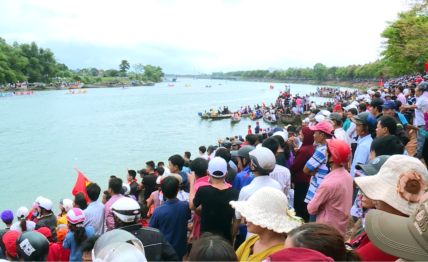 Hàng ngàn người dân tập trung hai bên bờ sông Bồ theo dõi các đội đua