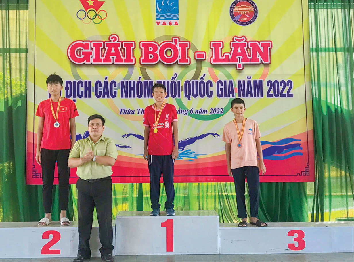 VĐV trẻ Võ Minh Nhật (bìa trái) đoạt 3 HCB tại Giải Bơi - Lặn vô địch các nhóm tuổi Quốc gia 2022 vừa mới diễn ra tại Huế