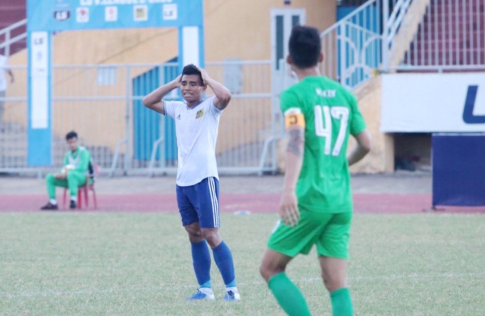 Khoảnh khắc của cầu thủ CLB Bóng đá Huế trong trận thua Bình Phước ngay trên sân nhà. Ảnh: Hữu Thành