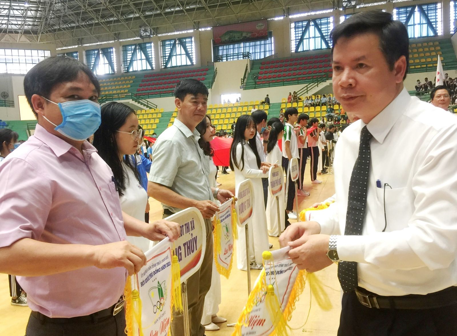 Ông Nguyễn Tân - Giám đốc Sở Giáo dục & Đào tạo tặng cờ lưu niệm cho các đơn vị tham dự
