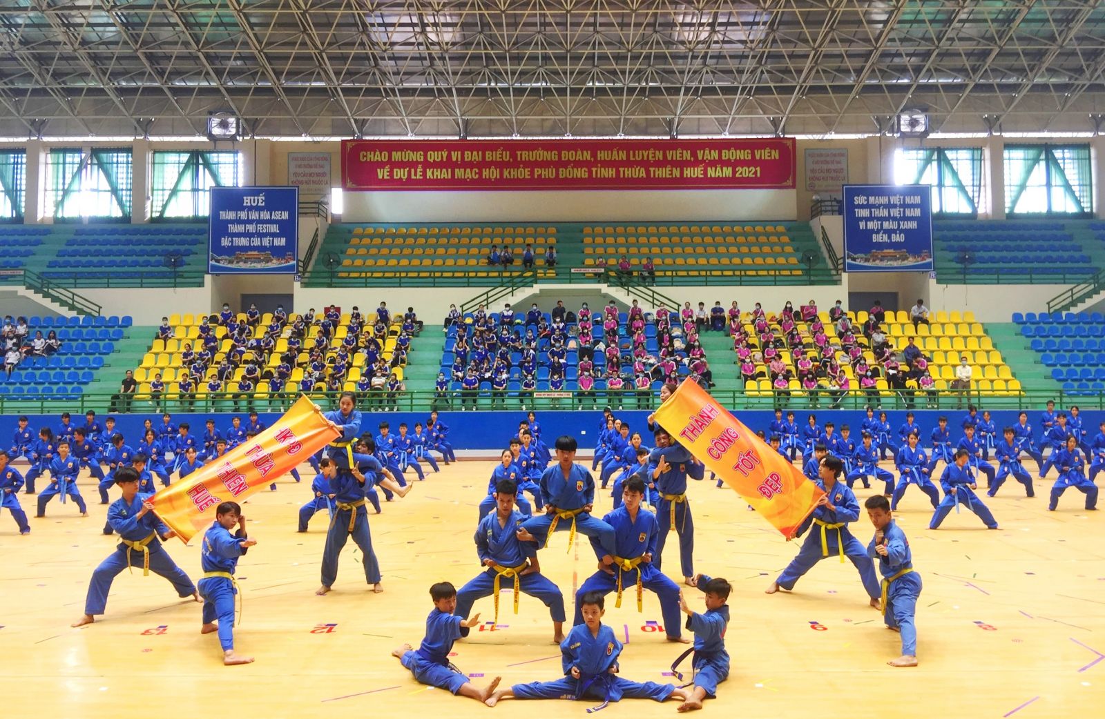 Sau lễ khai mạc, HKPĐ toàn tỉnh tiếp tục qua phần đồng diễn sinh động của hơn 500 học sinh đến từ trường mầm non Hoa Mai, trường THCS Phạm Văn Đồng, trường THPT Nguyễn Trường Tộ và Hội Vovinam Thừa Thiên Huế.