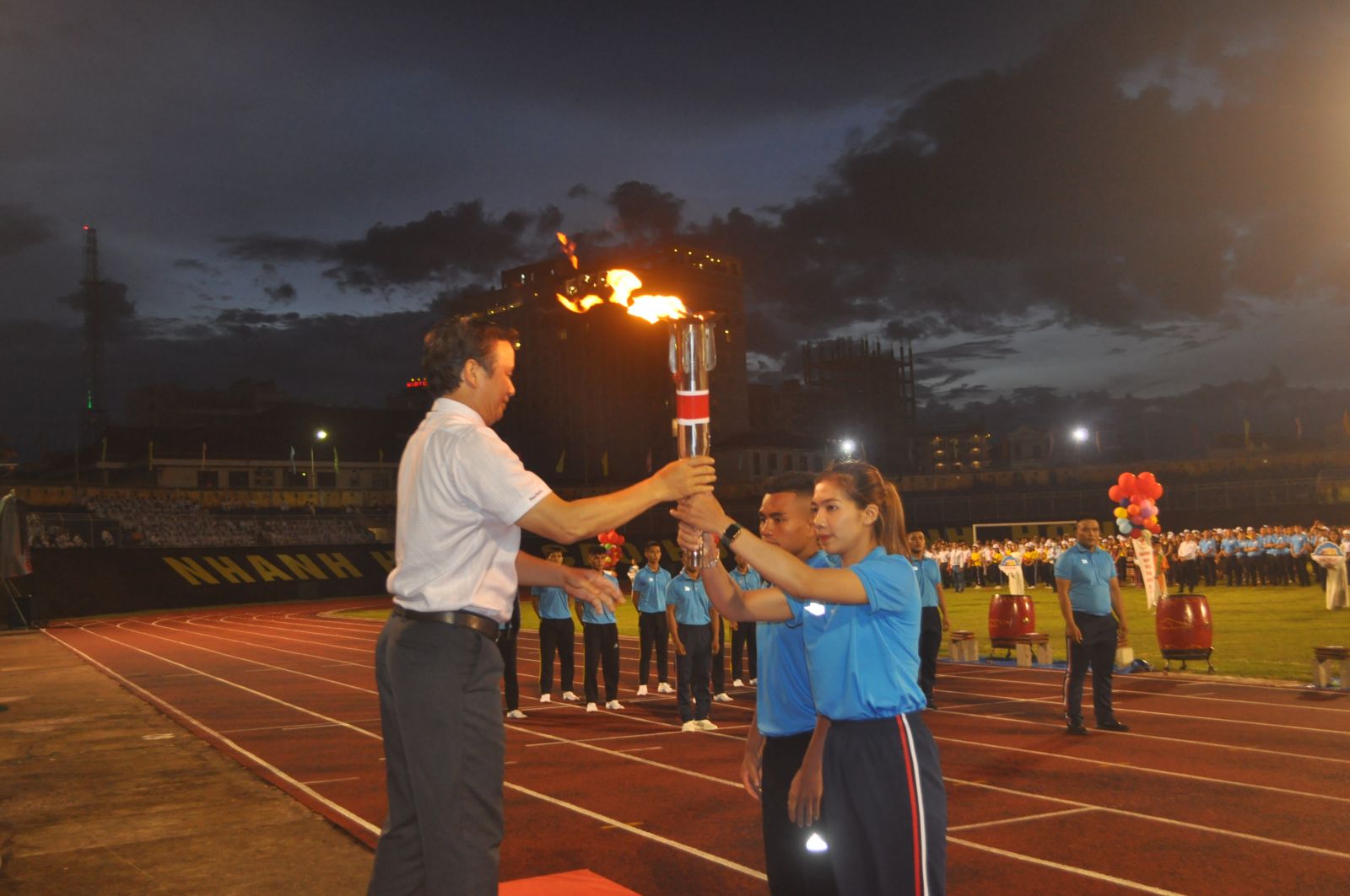Bí thư Tỉnh ủy Lê Trường Lưu trao đuốc Đại hội cho các VĐV đạt thành tích cao