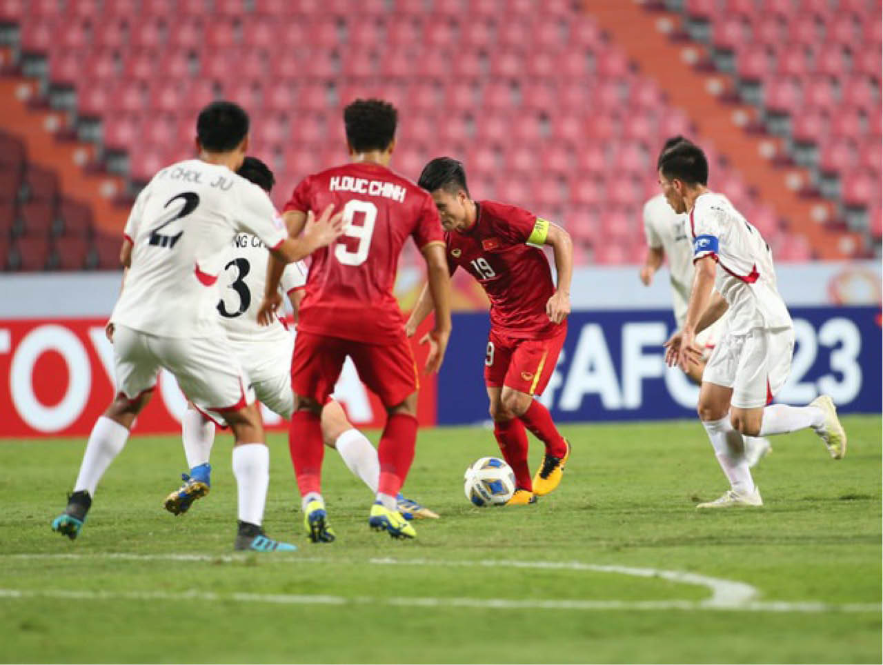 U23 Việt Nam thực sự khó khăn trước hàng thủ số đông của U23 Triều Tiên. Ảnh: Dân Trí