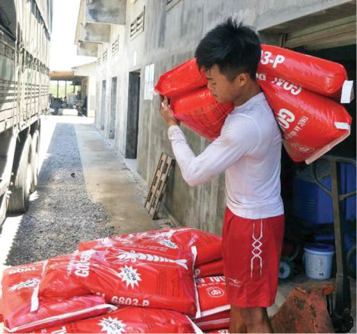 Hậu vệ Nguyễn Văn Trọng với công việc bốc vác thức ăn cho các hồ tôm