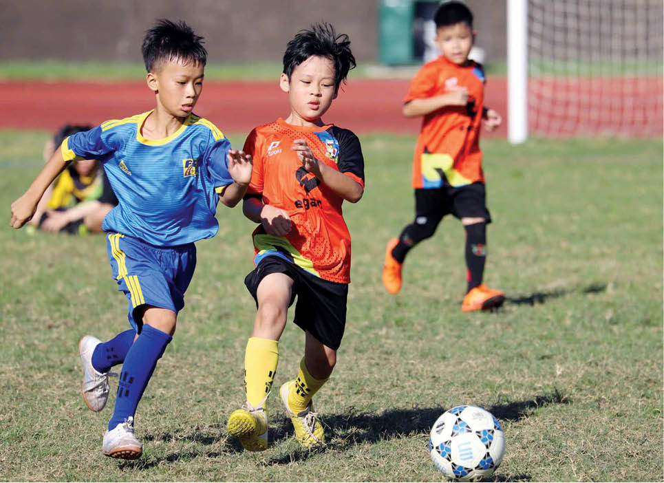 Môt pha tranh tài giữa các chân sút U11 Đoàn Bóng đá Huế (trái) và CLB Bóng đá Học đường Immanuel Huế