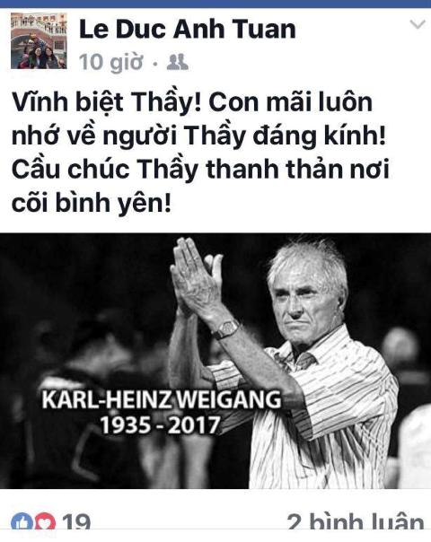 Trên facebook của mình, danh thủ Lê Đức Anh Tuấn, cựu tuyển thủ quốc gia đã bày tỏ những dòng cảm xúc khi biết tin cựu HLV trưởng đội tuyển Việt Nam Weigang qua đời: “Vĩnh biệt Thầy! Con mãi luôn nhớ về người Thầy đáng kính! Cầu chúc Thầy thanh thản nơi cõi bình yên!”…