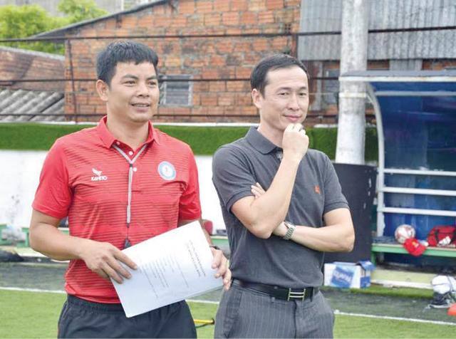 Lê Văn Trương (trái) và đàn anh Đặng Phương Nam ở ngày khai trương Trung tâm Bóng đá cộng đồng Văn Trương