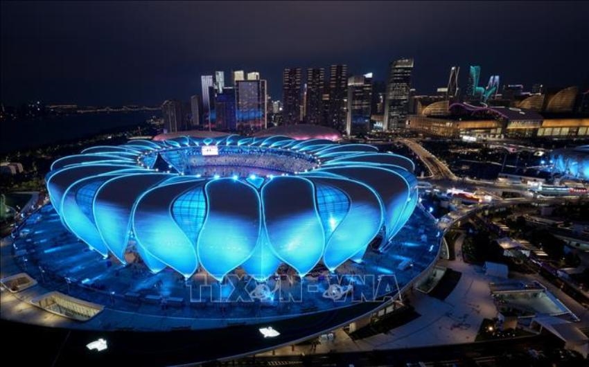 | Sân vận động Olympic tại thành phố Hàng Châu, tỉnh Chiết Giang, Trung Quốc, được thắp sáng khi diễn ra lễ khai mạc ASIAD lần thứ 19 ngày 23/9/2023. Ảnh: THX/TTXVN |