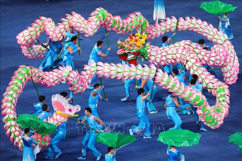 | Các nghệ sĩ biểu diễn tại lễ khai mạc ASIAD lần thứ 19 trên sân vận động Olympic tại thành phố Hàng Châu, tỉnh Chiết Giang, Trung Quốc, ngày 23/9/2023. Ảnh: THX/TTXVN |