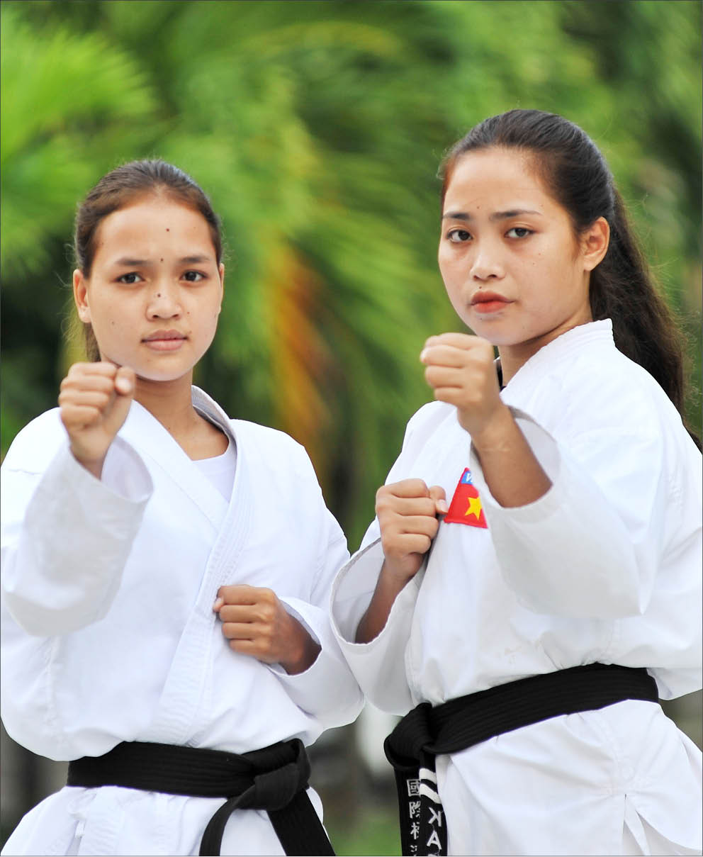 Từ trái qua: Hồ Thị Hoài Tành và Hồ Thị Hạ - 2 VĐV Karatedo giành được giải cao tại các đấu trường trong và ngoài nước