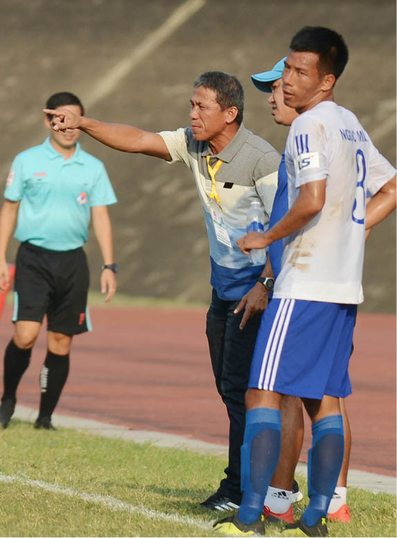 HLV Nguyễn Đức Dũng trao đổi chiến thuật với đồng nghiệp ở trận gặp Long An