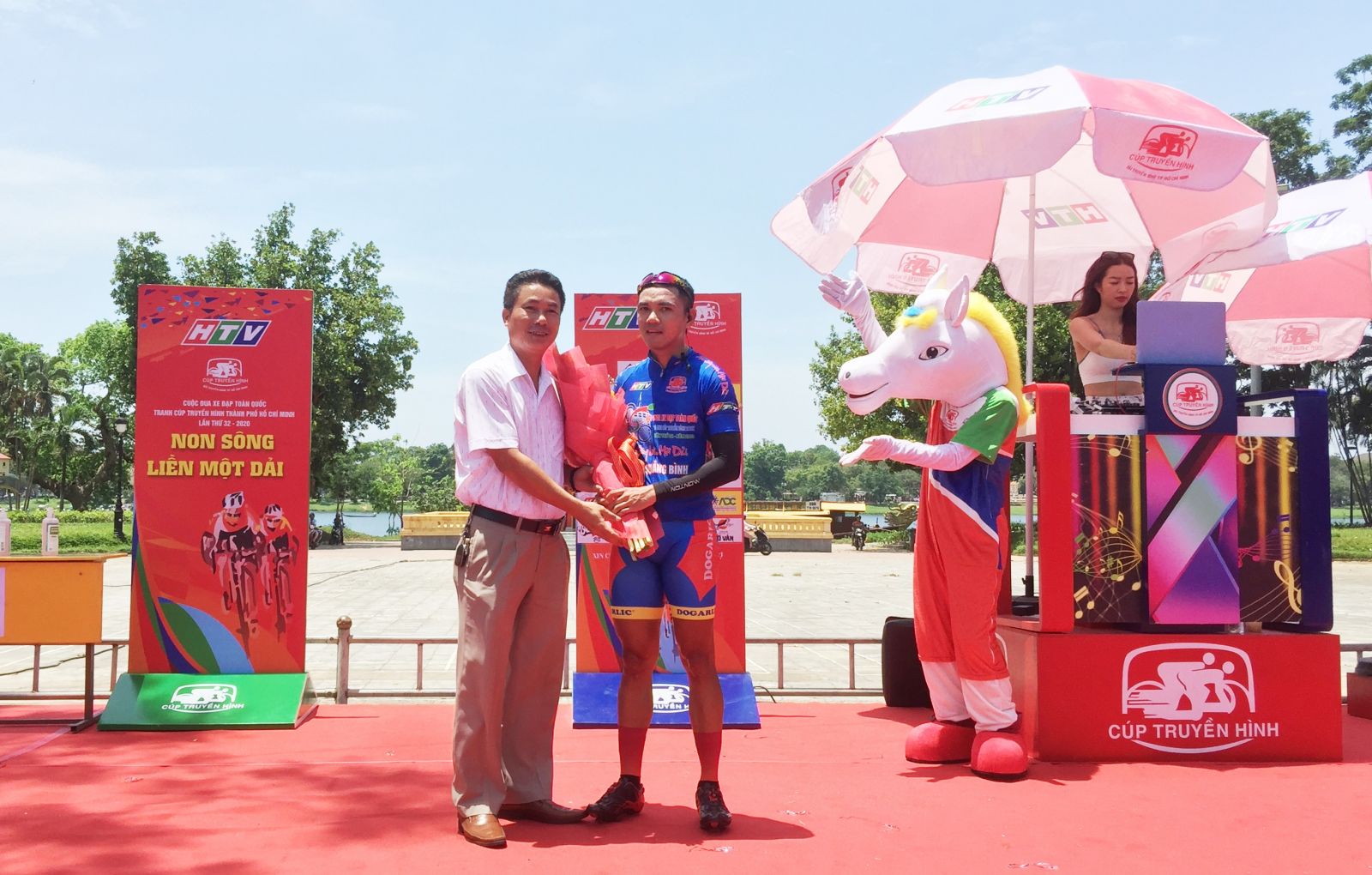 Ông Bùi Thanh Dũng - Phó Giám đốc Sở Văn hóa & Thể thao tặng hoa chúc mừng VĐV về đích đầu tiên ngay sau cuộc đua