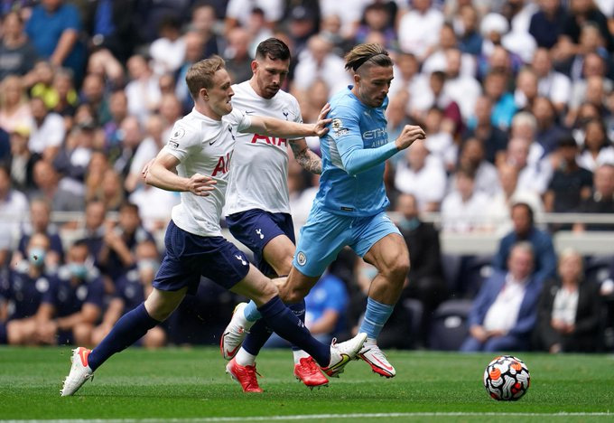 Đúng như dự đoán từ trước đó, 45 phút đầu tiên diễn ra với thế trận kiểm soát bóng của Man City còn Spurs chủ động chơi phòng ngự phản công, phong cách quen thuộc của đội bóng này. Trong khoảng 10 phút đầu tiên, trong khi hàng thủ đội chủ nhà vẫn chưa ổn định thì lần lượt những Guendogan, Fernandinho hay Joao Cancelo đều có những cơ hội cho riêng mình nhưng một chút thiếu may mắn khiến họ không thể ghi tên mình lên bảng điện tử. Ngôi sao được chờ đợi nhất ở trận đấu này, Grealish thi đấu rất tích cực, nhưng bản hợp đồng trị giá 100 triệu bảng đã gần như mất hút trước sức trẻ và lối chơi quyết liệt của hậu vệ trẻ Tanganga bên phía đội chủ nhà.