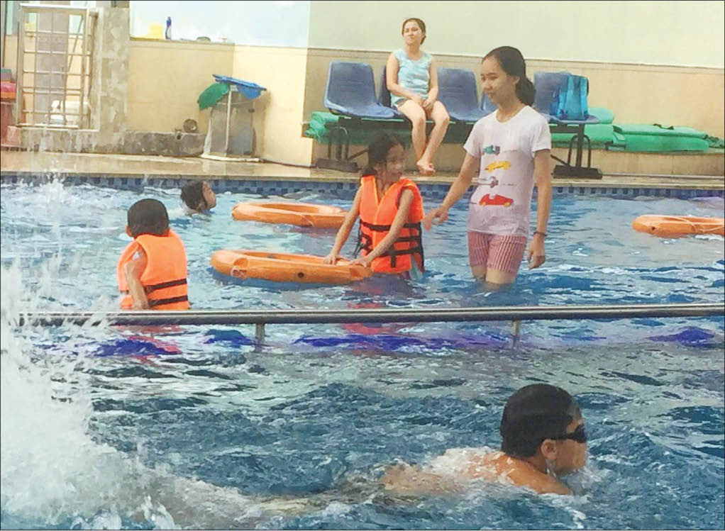 Ấy vậy mà chỉ chừng vài phút thấy bạn dưới nước nô đùa, hò reo, nhiều đứa mon men đến thành bể, rụt rè nhúng tay, rồi chân, rồi cả người xuống nước, tất nhiên vẫn nổi nhờ áo phao ngang người trong tiếng động viên của phụ huynh trên bờ.