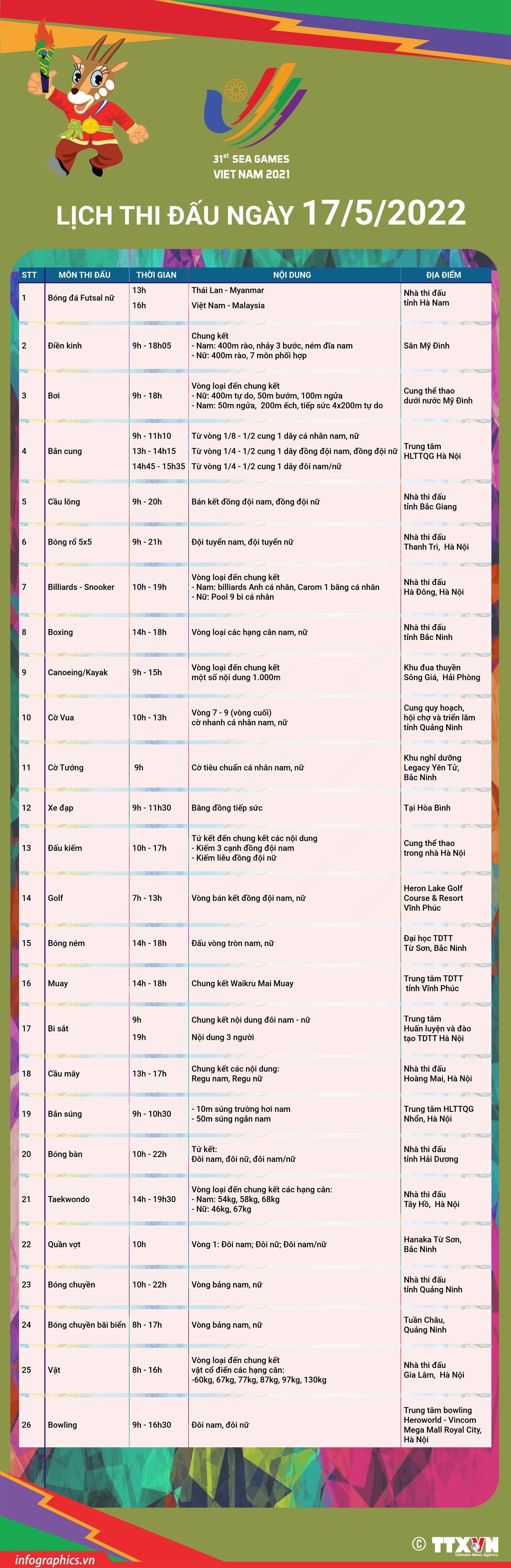 SEA Games 31: Lịch thi đấu ngày 17/5/2022